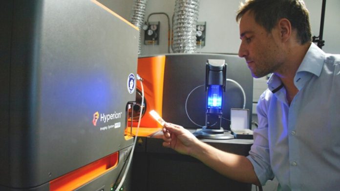 Tels des explorateurs du microenvironnement tumoral, les chercheurs savent que, pour tout territoire à peine foulé du pied, il convient d’abord d’en tracer la carte. Pour les y aider, une intrigante machine ronronne à leurs côtés depuis quelques mois : l’Hypérion. Associée au spectromètre de masse Hélios, cette plateforme, la première de son genre en France, est capable d’analyser une cinquantaine de marqueurs cellulaires simultanément à partir d’une biopsiebiopsiePrélèvement d’un échantillon de tissu, réalisé à des fins d’analyses. de tumeur solide, – permettant ainsi de visualiser de manière fine qui communique avec qui au sein du tissu – et de représenter le fameux réseau social des cellules. Les chercheurs ont malicieusement baptisé ce réseau « Cellbook ». Armés de ce spectaculaire outil, ils espèrent élucider les mystères écologiques de la tumeur, et comprendre comment elle organise la résistance aux traitements.